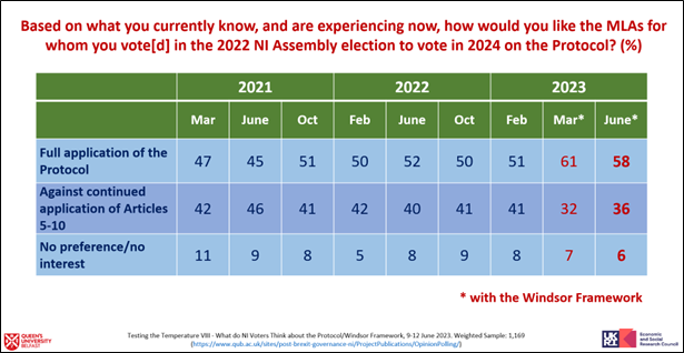 Our polling in June 2023 finds that there has been an increase in acceptance of the Protocol with the Windsor Framework: 58 % of voters now support MLAs voting in favour of the continued application of the Protocol in their 2024 democratic consent vote. Previously (February 2023) the proportion had been 51%. The figures could not hide the fact that the Protocol remains contested, with opposition, as previously, being particularly strong among voters identifying as ‘strongly unionist’.