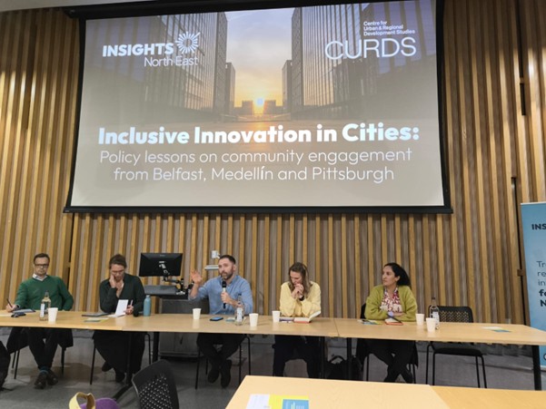 That evening, the Pittsburgh, Medellín, and Newcastle colleagues launched their book about improving inclusive innovation outcomes. A panel of i3o colleagues including Dr. Gareth Robinson (QUB) then discussed their respective contexts and insights on community engagement . They touched on differences in spatial distribution of innovation in their cities, devolution of decision-making, respective skills pipelines, the timelines for change, and their local histories which impacted current inclusive innovation.
